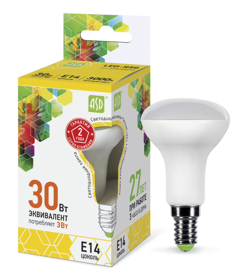 ASD лампа светодиодная R50 3W Е14 3000К теплая