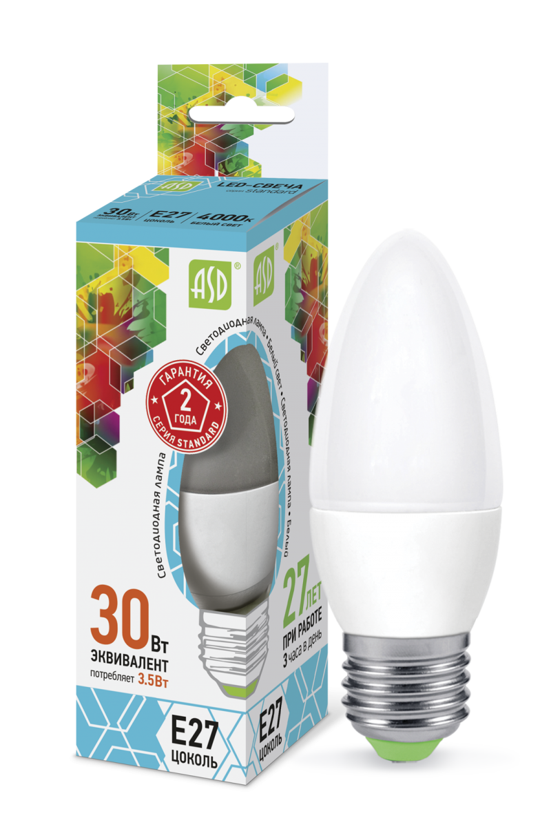ASD лампа светодиодная СВЕЧА 3.5W Е27 4000К холодная