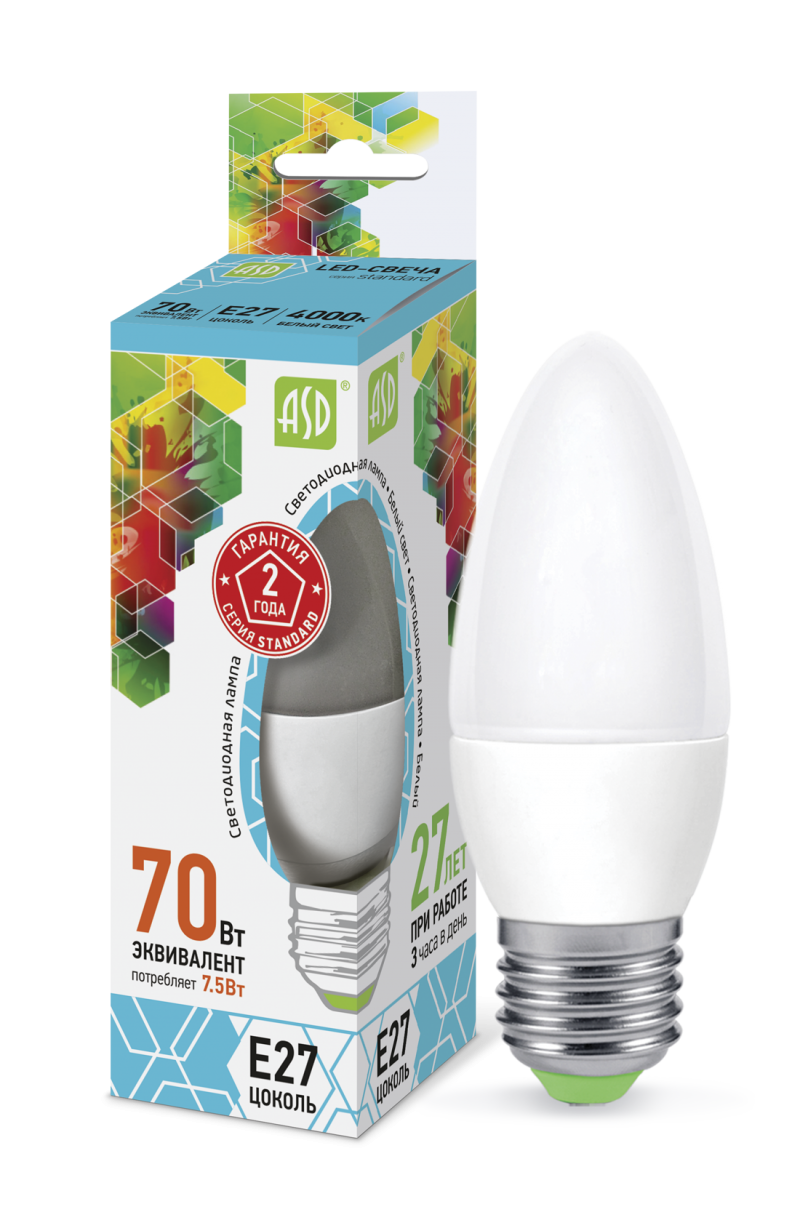 ASD лампа светодиодная СВЕЧА 7.5W Е27 4000К холодная