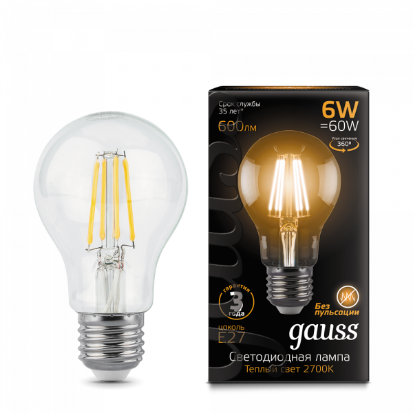Gauss лампа светодиодная филамент ЛОН A60 E27 6W 2700К