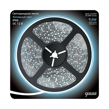 Gauss Лента LED 2835/120-SMD 9.6W 12V DC холодный белый IP66 (блистер 5м)