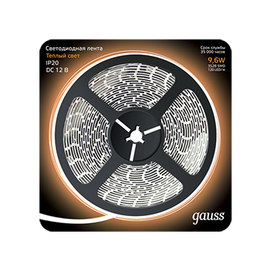 Gauss Лента LED 2835/120-SMD 9.6W 12V DC теплый белый (блистер 5м)
