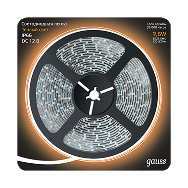 Gauss Лента LED 2835/120-SMD 9.6W 12V DC теплый белый IP66 (блистер 5м)