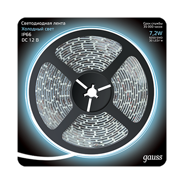 Gauss Лента LED 5050/30-SMD 7.2W 12V DC холодный белый IP66 (блистер 5м)