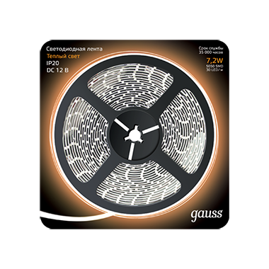 Gauss Лента LED 5050/30-SMD 7.2W 12V DC теплый белый (блистер 5м)
