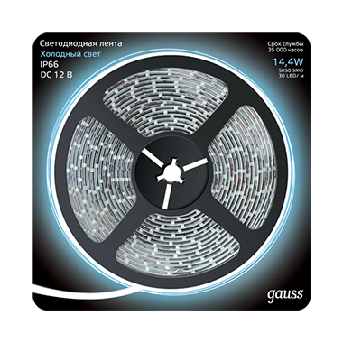 Gauss Лента LED 5050/60-SMD 14.4W 12V DC холодный белый IP66 (блистер 5м)