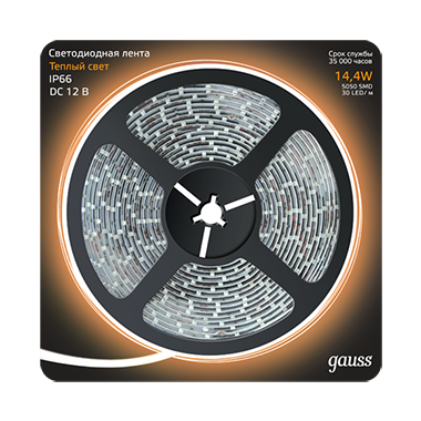 Gauss Лента LED 5050/60-SMD 14.4W 12V DC теплый белый IP66 (блистер 5м)