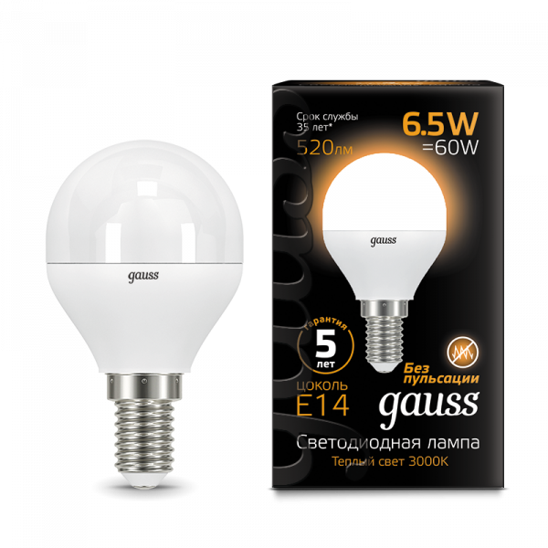Gauss светодиодный шарик матовый E14 6.5W 2700K