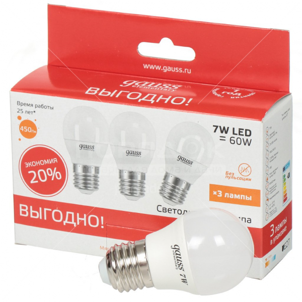 Комплект ламп Gauss LED Elementary Шар 7W E27 2700K 1/40 (3 лампы в упаковке)