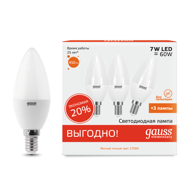 Комплект ламп Gauss LED Elementary Свеча 7W E14 2700K 1/40 (3 лампы в упаковке)