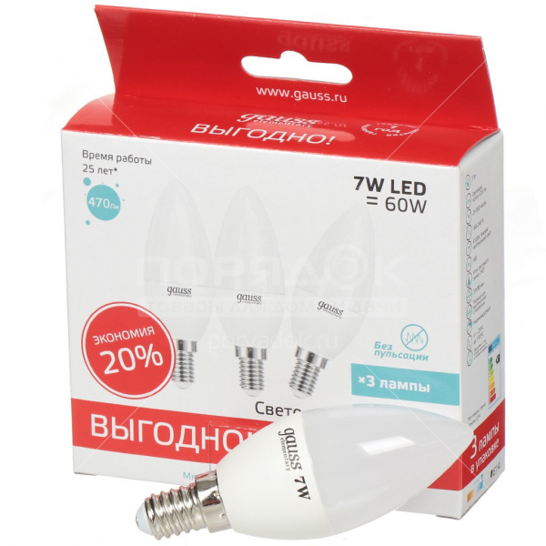 Комплект ламп Gauss LED Elementary Свеча 7W E14 4100K 1/40 (3 лампы в упаковке)