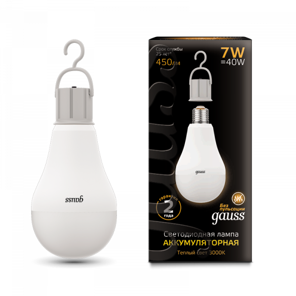 Лампа Gauss LED A60 7W E27 450lm 3000K с Li-Ion аккумулятором 1/10/60
