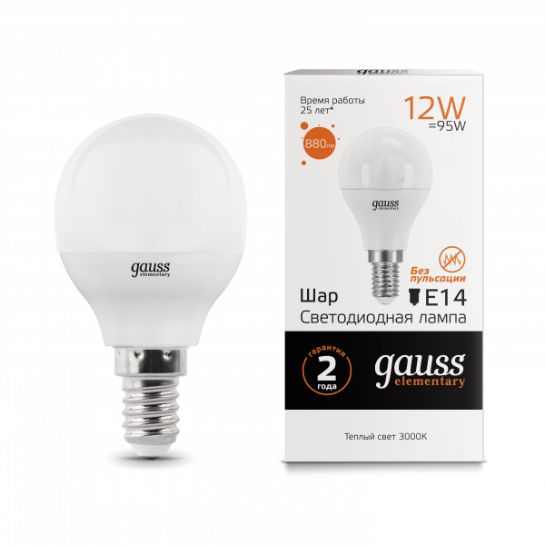 Лампа Gauss LED Elementary Шар 12W 880lm E14 3000K