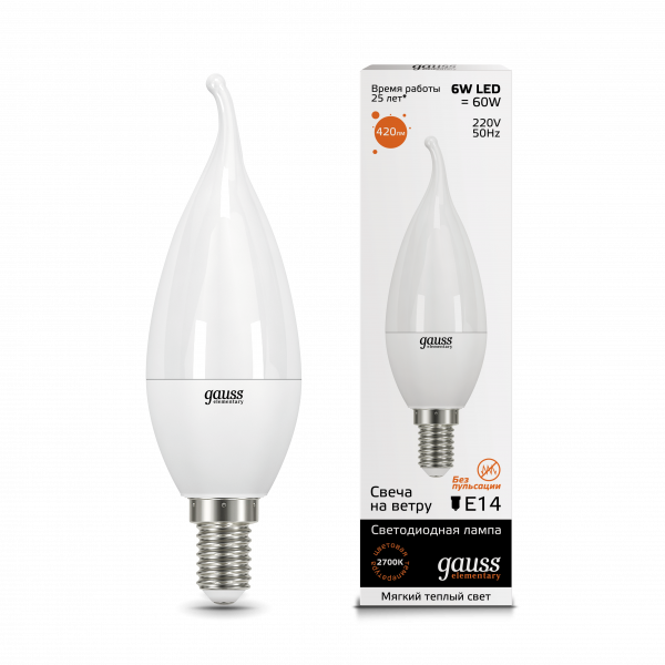 Лампа Gauss LED Elementary свеча на ветру 6W E14 2700K