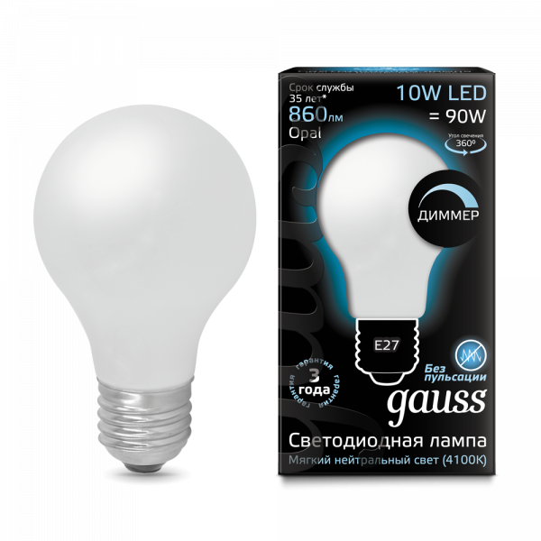 Лампа Gauss LED Filament A60 OPAL диммируемая E27 10W 4100К
