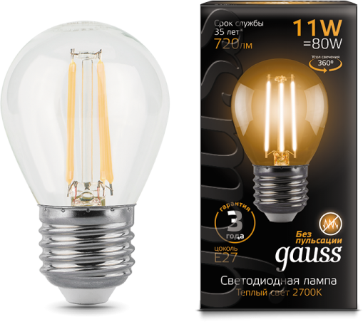 Лампа Gauss LED Filament Шар E27 11W 720lm 2700K