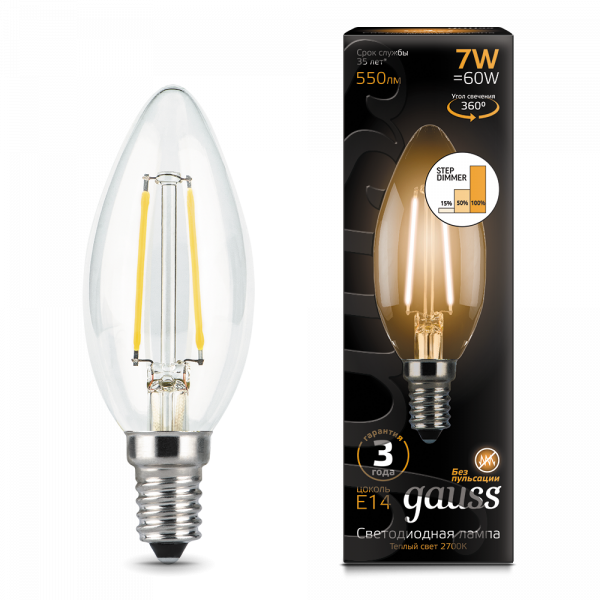 Лампа Gauss LED Filament Свеча E14 7W 550lm 2700К step dimmable