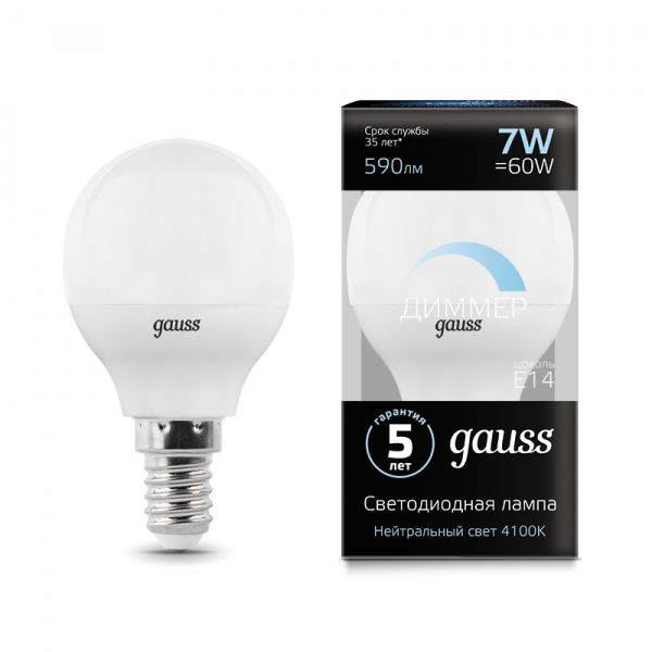 Лампа Gauss LED шарик диммируемый E14 7W 4100К