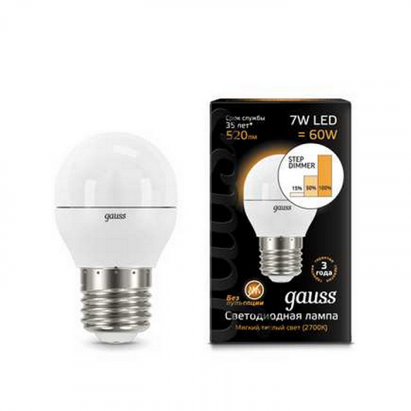 Лампа Gauss LED шарик пошагово диммируемый E27 7W 2700K