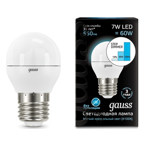 Лампа Gauss LED шарик пошагово диммируемый E27 7W 4100K