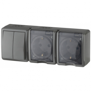 ЭРА Эксперт Блок выключатель 2 кл. + розетка 2-я с/з с крышкой IP54 серый