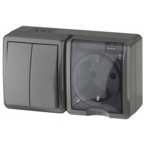ЭРА Эксперт Блок выключатель 2 кл. + розетка с/з с крышкой IP54 серый