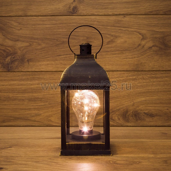 Декоративный фонарь с лампочкой, бронзовый корпус, размер 10.5х10.5х22,5 см, цвет ТЕПЛЫЙ БЕЛЫЙ