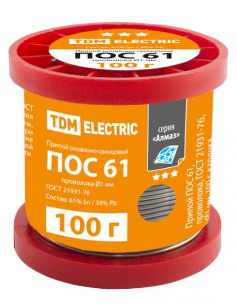 Припой ПОС 61, проволока, ГОСТ 21931-76, Ø1 мм, 100 г, катушка, серия "Алмаз" TDM