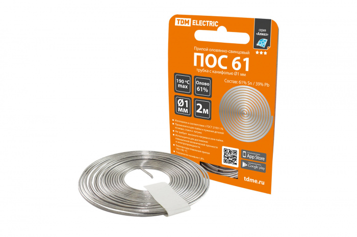 Припой ПОС 61, трубка с канифолью, ГОСТ 21931-76, Ø1 мм, 2 м, спираль, серия "Алмаз" TDM