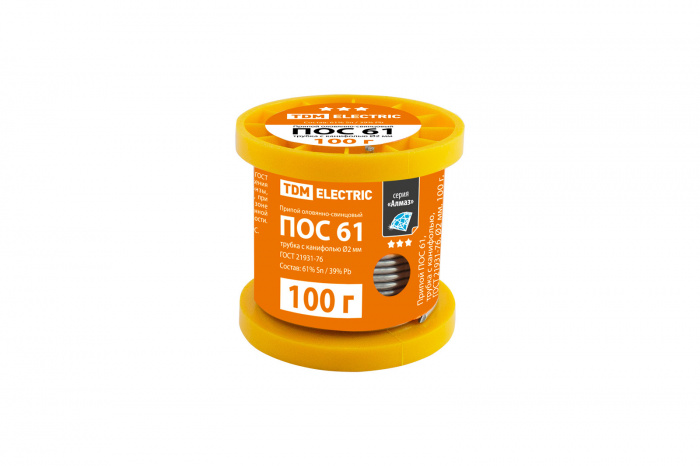 Припой ПОС 61, трубка с канифолью, ГОСТ 21931-76, Ø2 мм, 100 г, катушка, серия "Алмаз" TDM