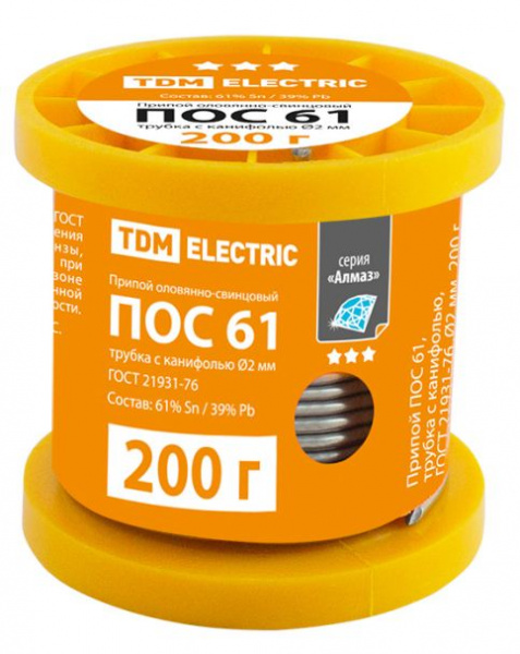 Припой ПОС 61, трубка с канифолью, ГОСТ 21931-76, Ø2 мм, 200 г, катушка, серия "Алмаз" TDM