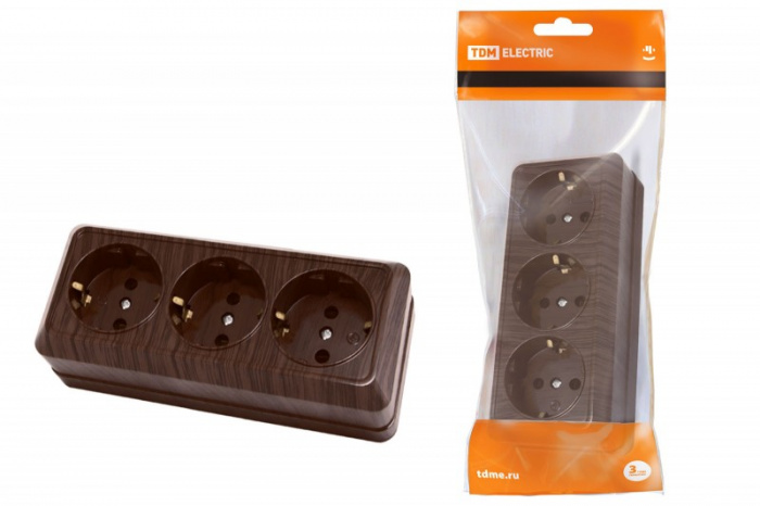 Розетка 3-х местная горизонтальная с заземлением открытой установки IP20 16A бук "Ладога" TDM