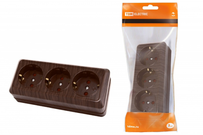 Розетка 3-х местная горизонтальная с заземлением открытой установки IP20 16A с защитными шторками бук "Ладога" TDM