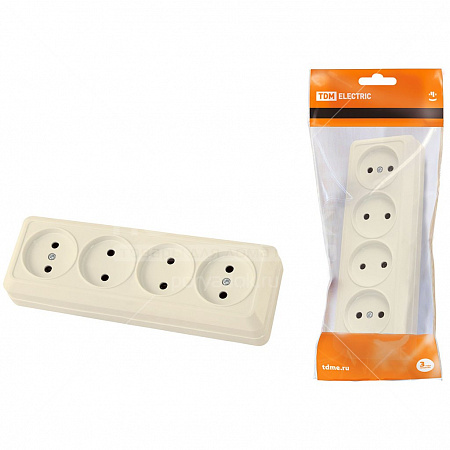 Розетка 4-х местная горизонтальная открытой установки IP20 10A с защитными шторками крем "Ладога" TDM