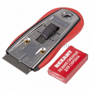 Скребок с выдвижным лезвием, обрезиненный корпус, 5 запасных лезвий в комплекте REXANT
