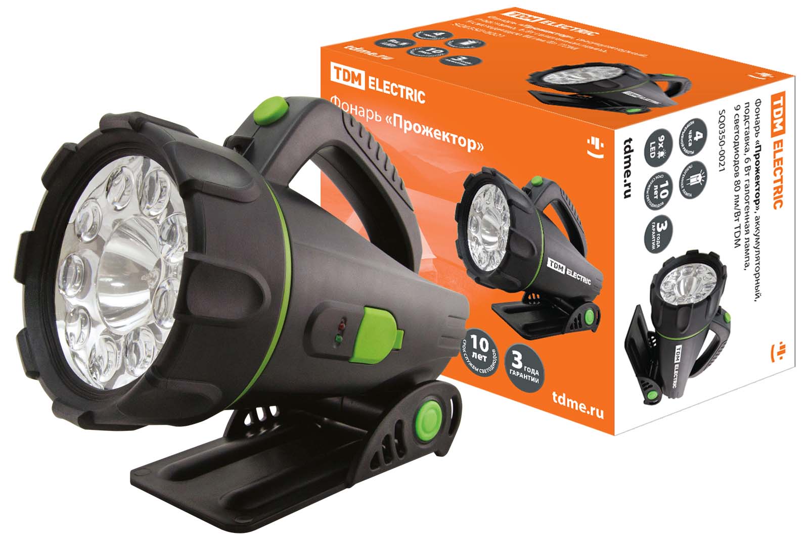 TDM фонарь "Прожектор", аккумуляторный, подставка, 6 Вт галогенная лампа+ 9 светодиодов