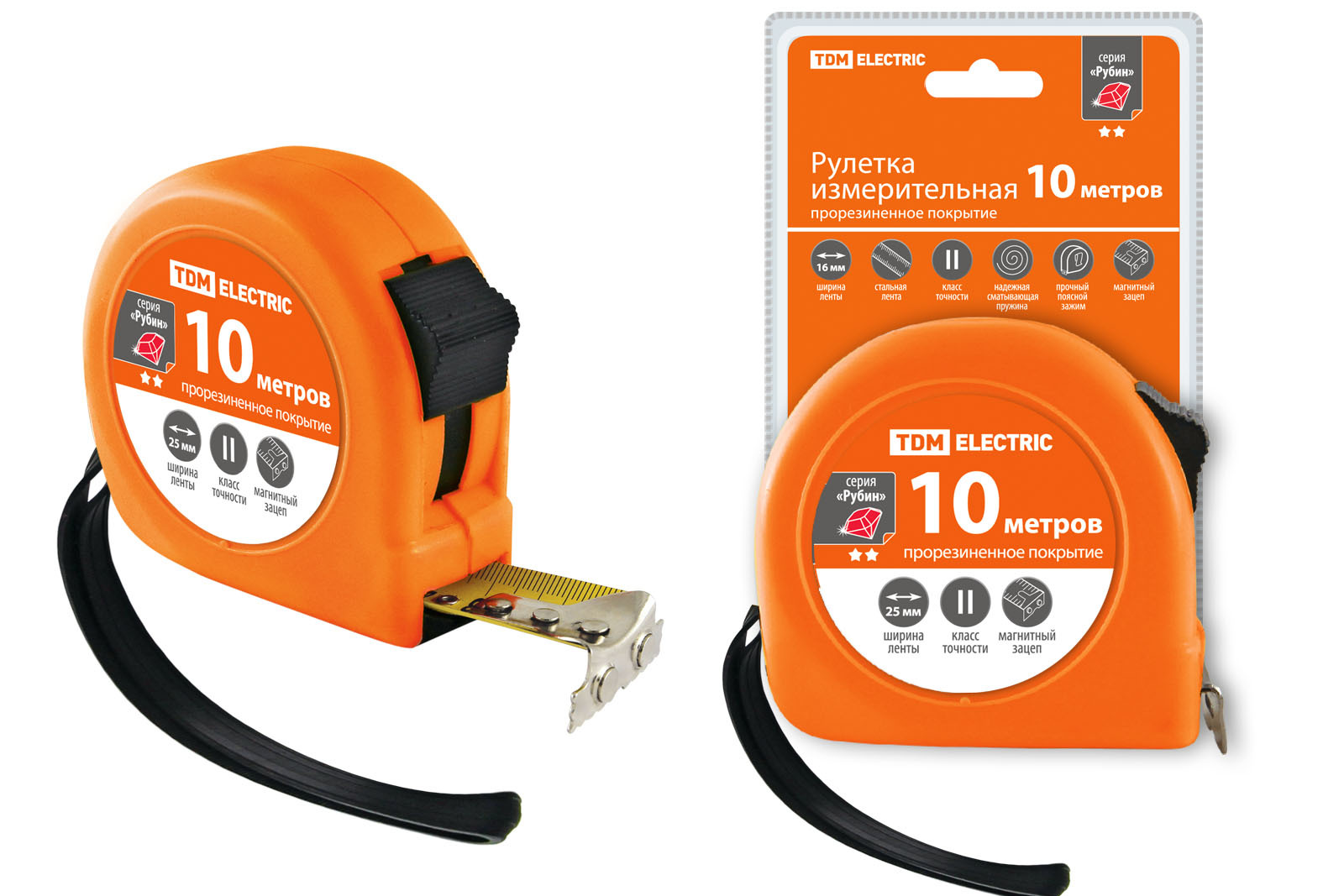 TDM Рулетка 10 м, стальная лента, ширина 25 мм, прорезиненное покрытие, магнит, "Рубин"