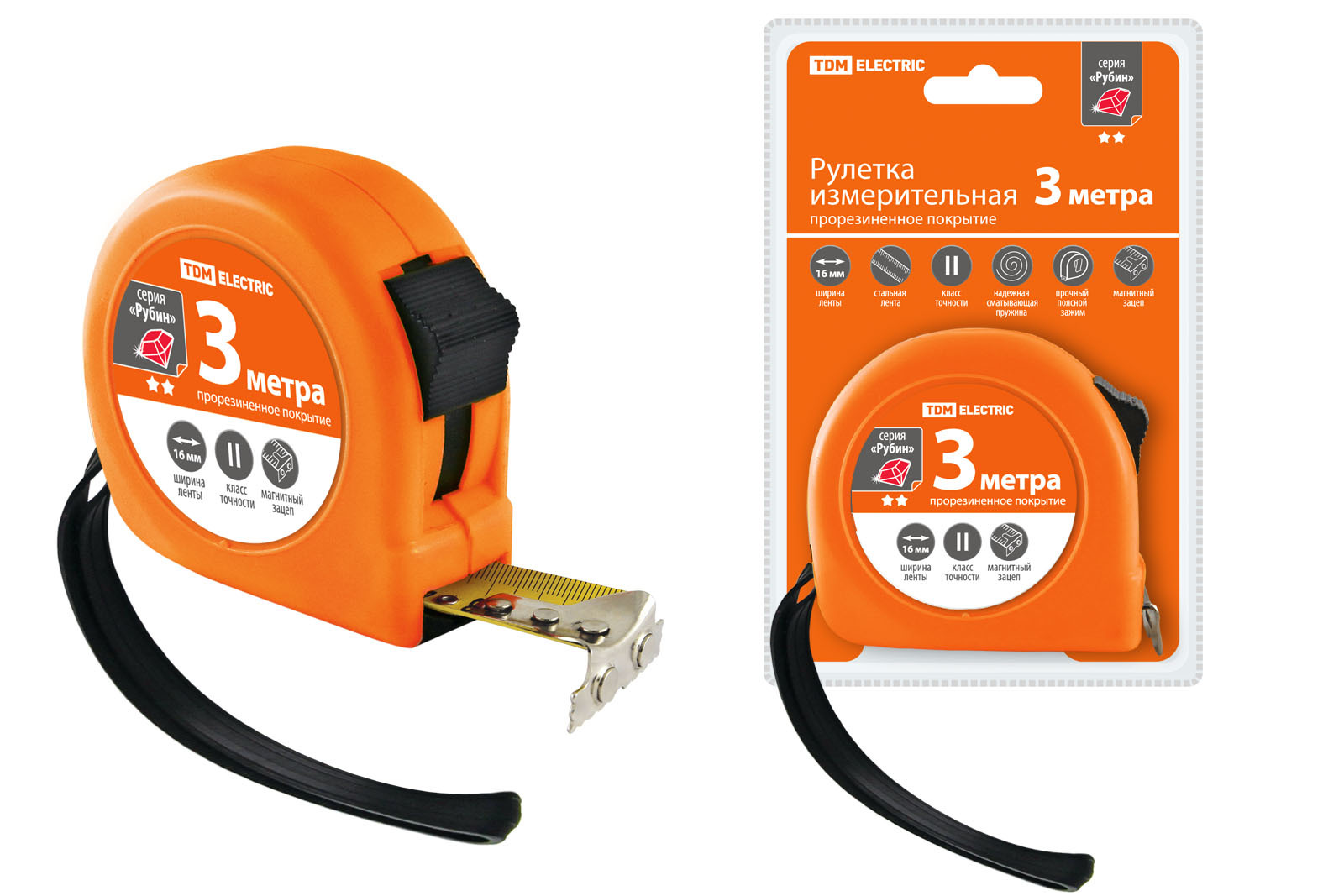 TDM Рулетка 3 м, стальная лента, ширина 16 мм, прорезиненное покрытие, магнит, "Рубин"