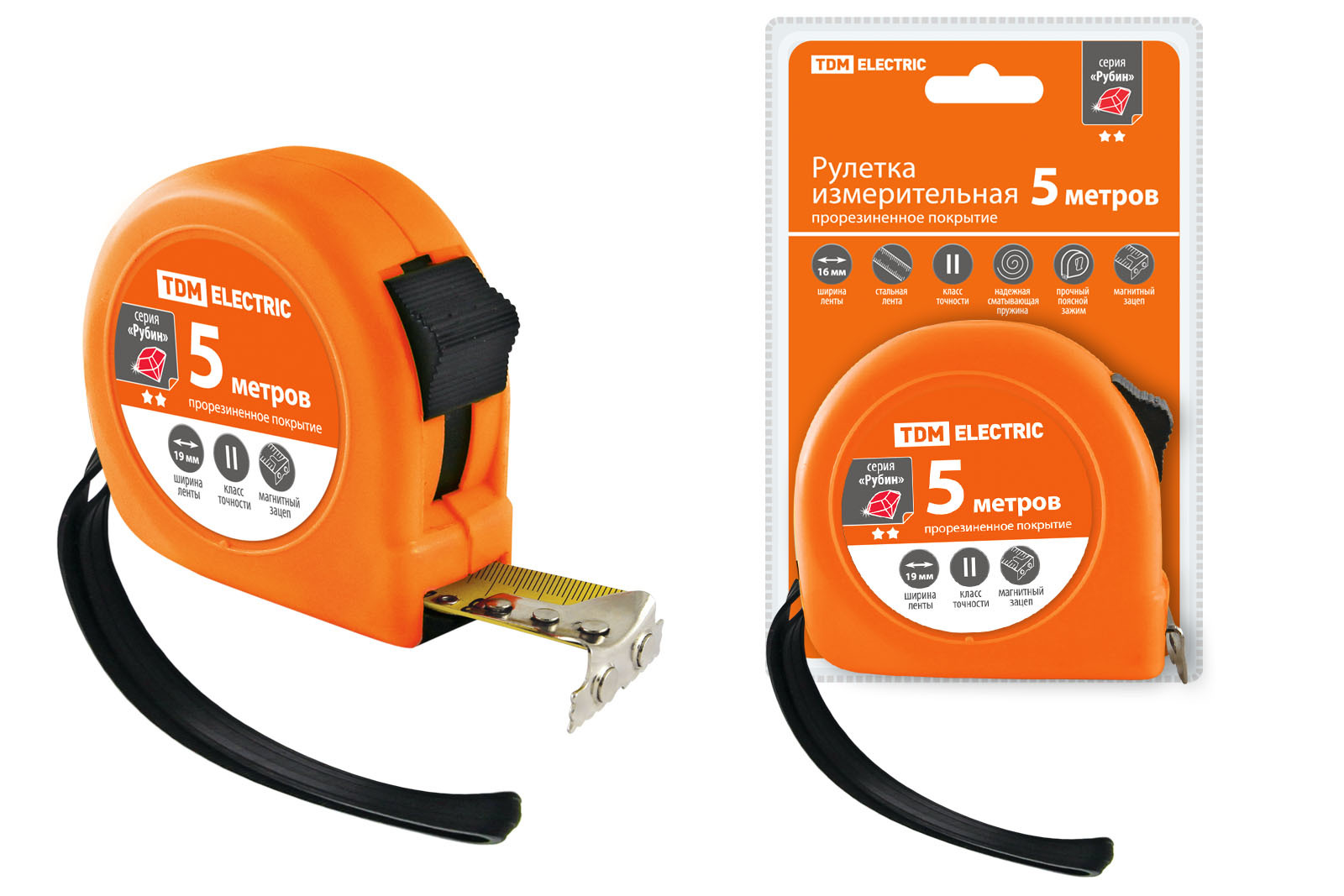 TDM Рулетка 5 м, стальная лента, ширина 19 мм, прорезиненное покрытие, магнит, "Рубин"