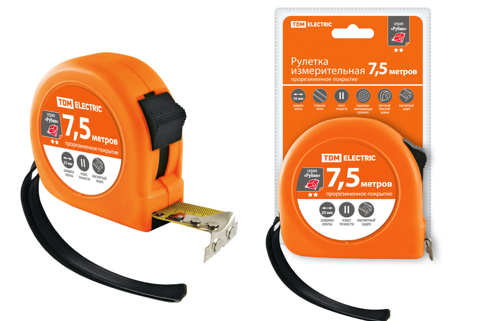 TDM Рулетка 7.5 м, стальная лента, ширина 25 мм, прорезиненное покрытие, магнит, "Рубин"