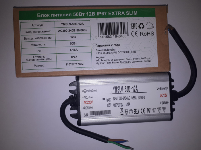 Блок питания 50W Extra Slim алюминий IP67